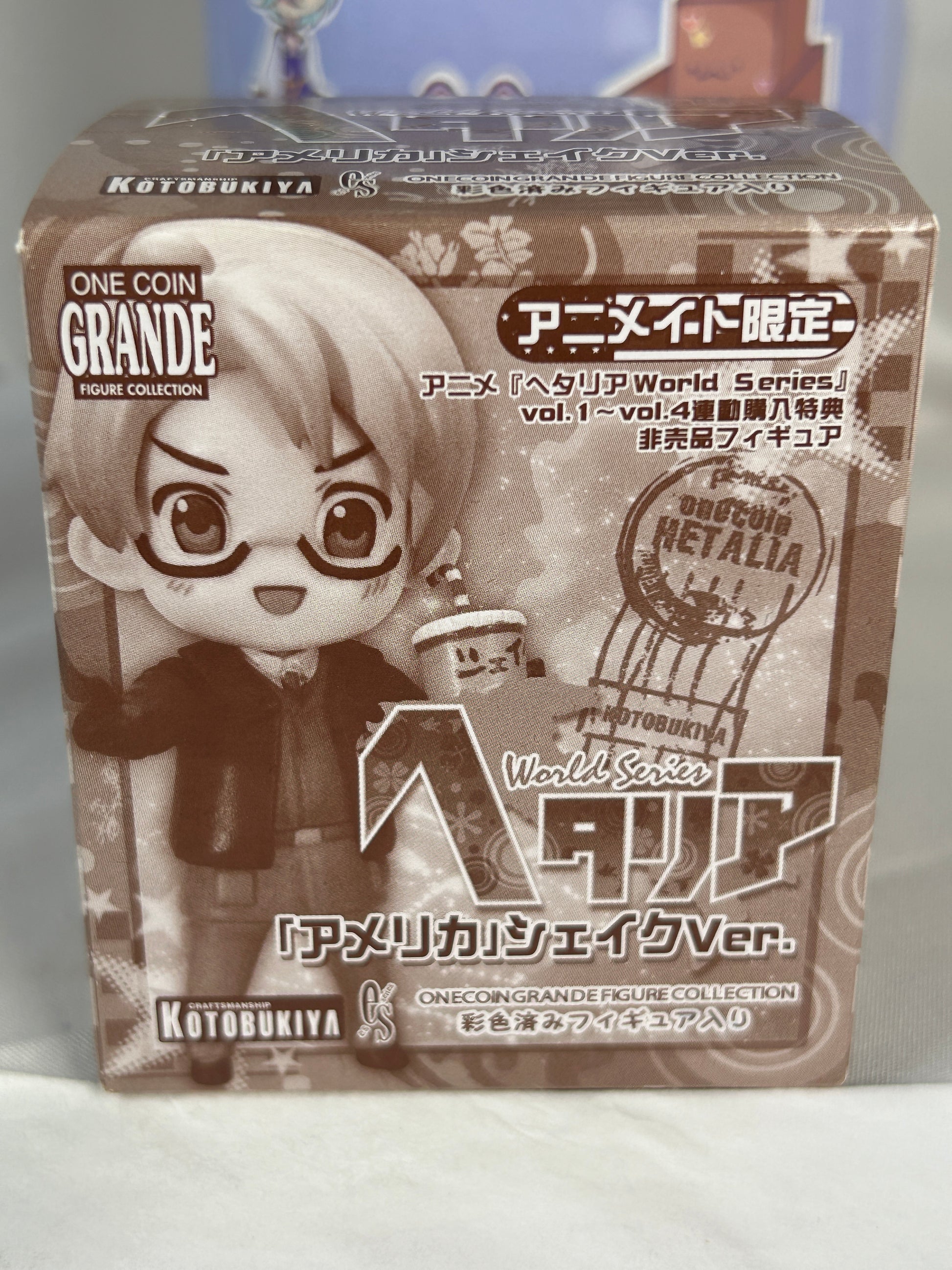 SUGOIII! This America One Coin Grande Mini Figure from Hetalia World 2009 by Kotobukiya is super duper adorable! :D With his charming smile and cute pose, he captures the essence of America perfectly! UwU The details are so kawaii, from his stylish outfit to his playful expression! Owo Perfect for collectors or fans of Hetalia, this figure will make your heart go doki doki! Don't miss out on adding this precious gem to your collection! :3